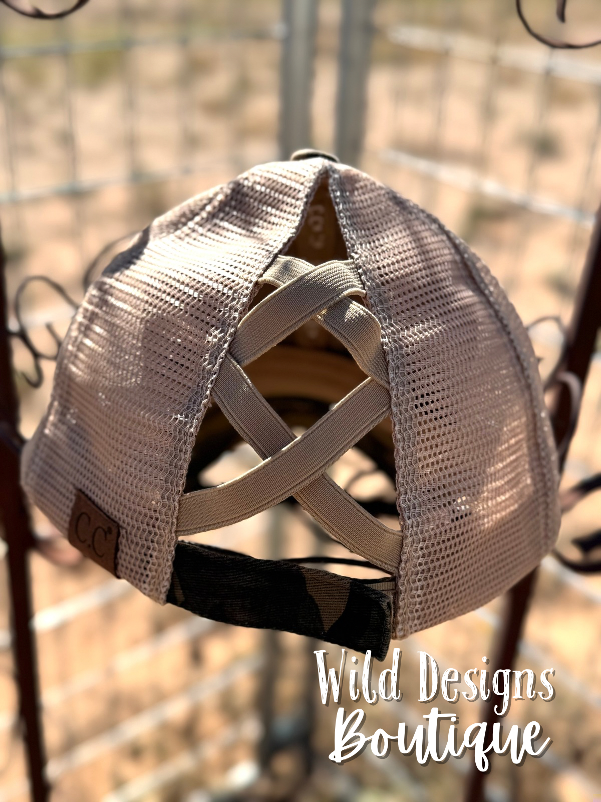 C.C Washed Denim with Crossed Elastic Band Mesh Pony Cap