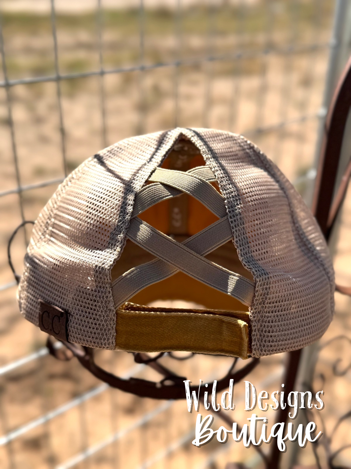 C.C Washed Denim with Crossed Elastic Band Mesh Pony Cap